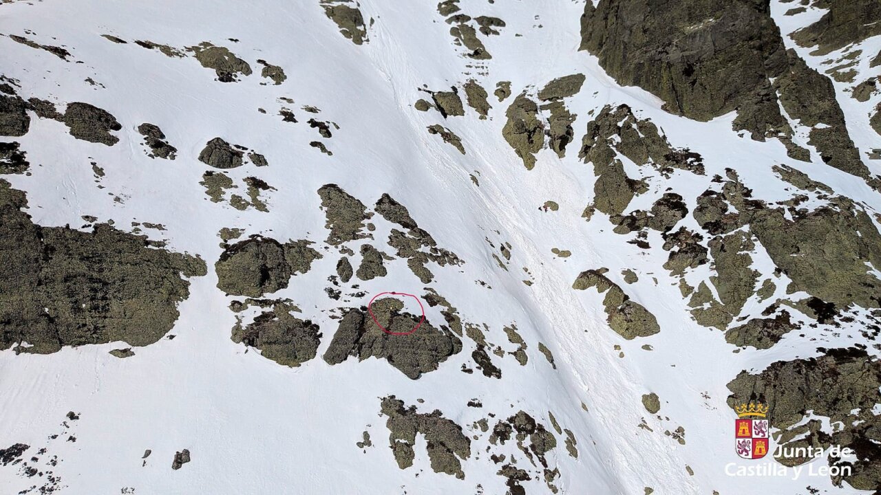 Imagen del rescate en Triollo, mostrando la nieve y las rocas.