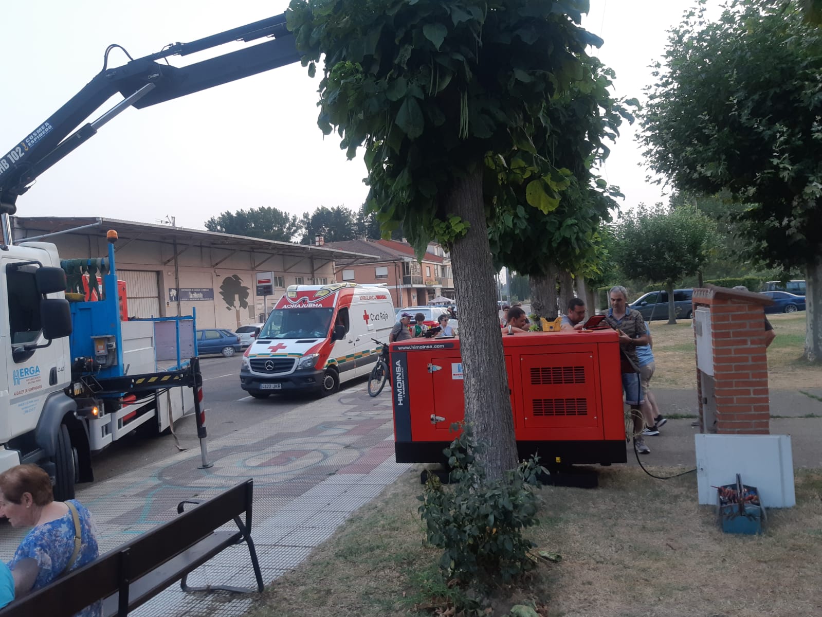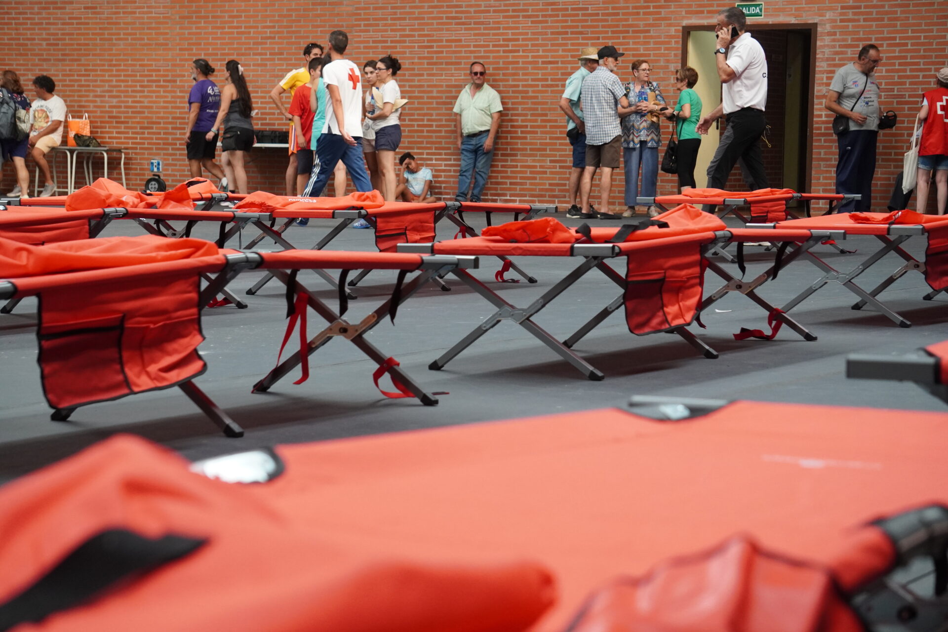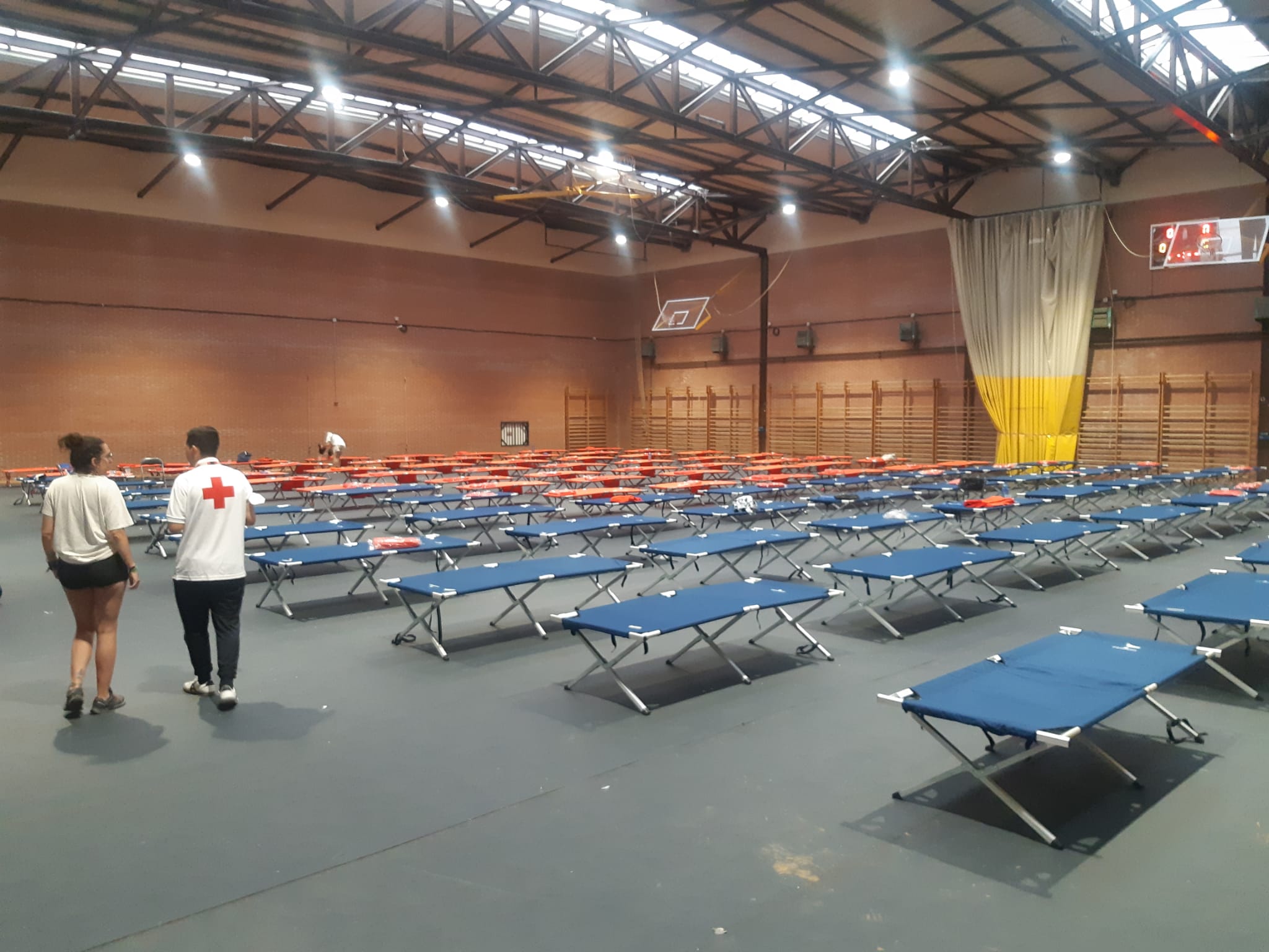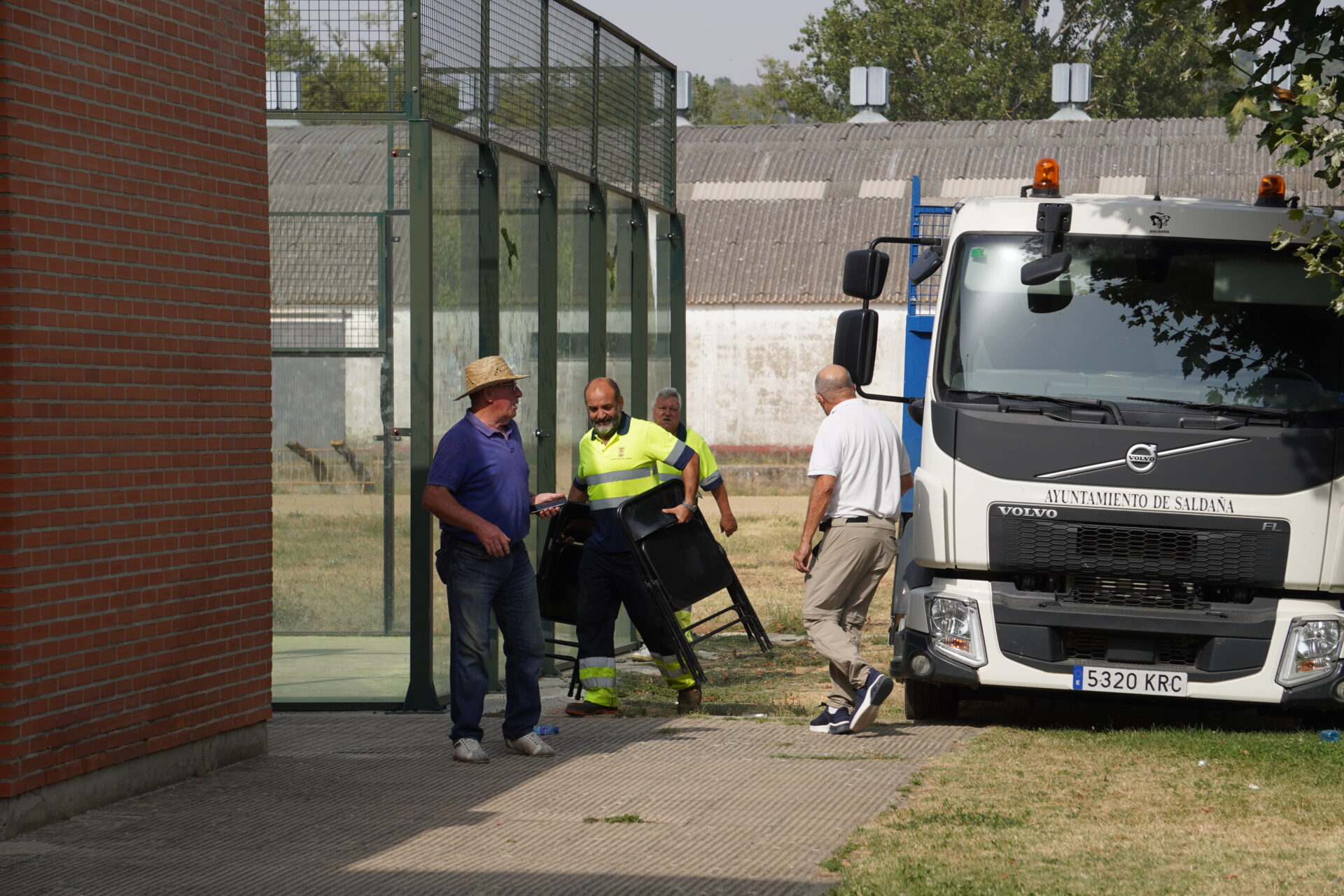 El Ayuntamiento de Saldaña, Cruz Roja, voluntarios y empresas de la localidad participan en la creación de un albergue de campaña en la localidad para las personas evacuadas por el incendio forestal