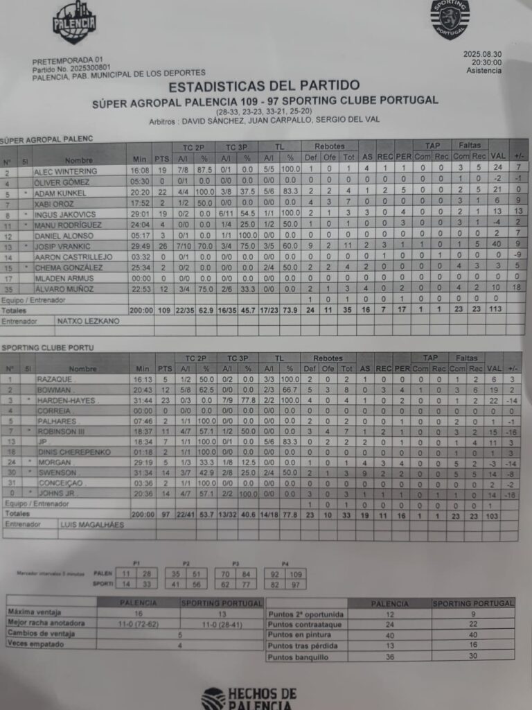 Un primer partido en el que se demostró que Palencia ha fichado bien, con Vranikc (19 puntos antes del descanso), Jakovics (19 en la segunda parte) y que ha mantenido a un exterior con mucha mano, Kunkel y un base que cuando le dan minutos se crece, como Wintering (19 puntos) pero que tienen que trabajar aún mucho por afinar su juego ante rivales de empeño. Del interior poco se puede hablar porque faltaron dos de los tres 5.