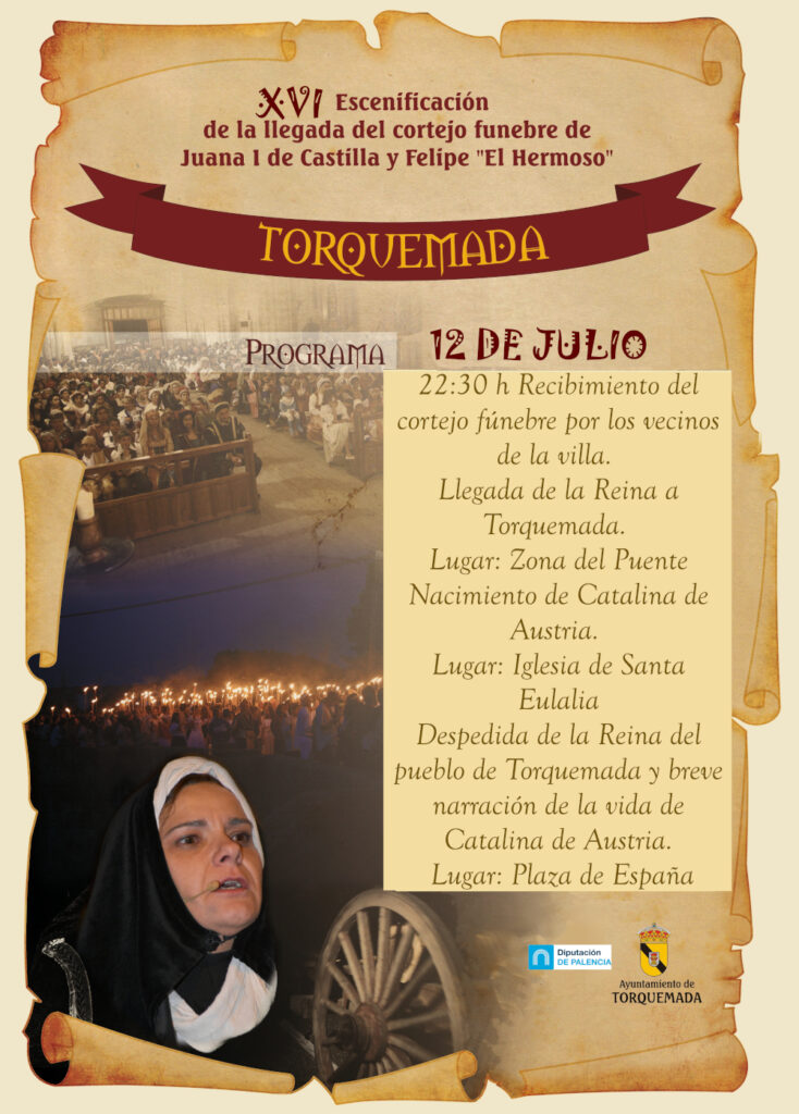 La famosa escenificación de la llegada del cortejo fúnebre de Juana I de Castilla y Felipe el Hermoso regresa mañana sábado 12 de julio a Torquemada. Será el inicio de la programación cultural de verano del municipio, presentada este viernes en la Diputación de Palencia por el alcalde Jorge Martínez y la diputada Patricia Pérez.