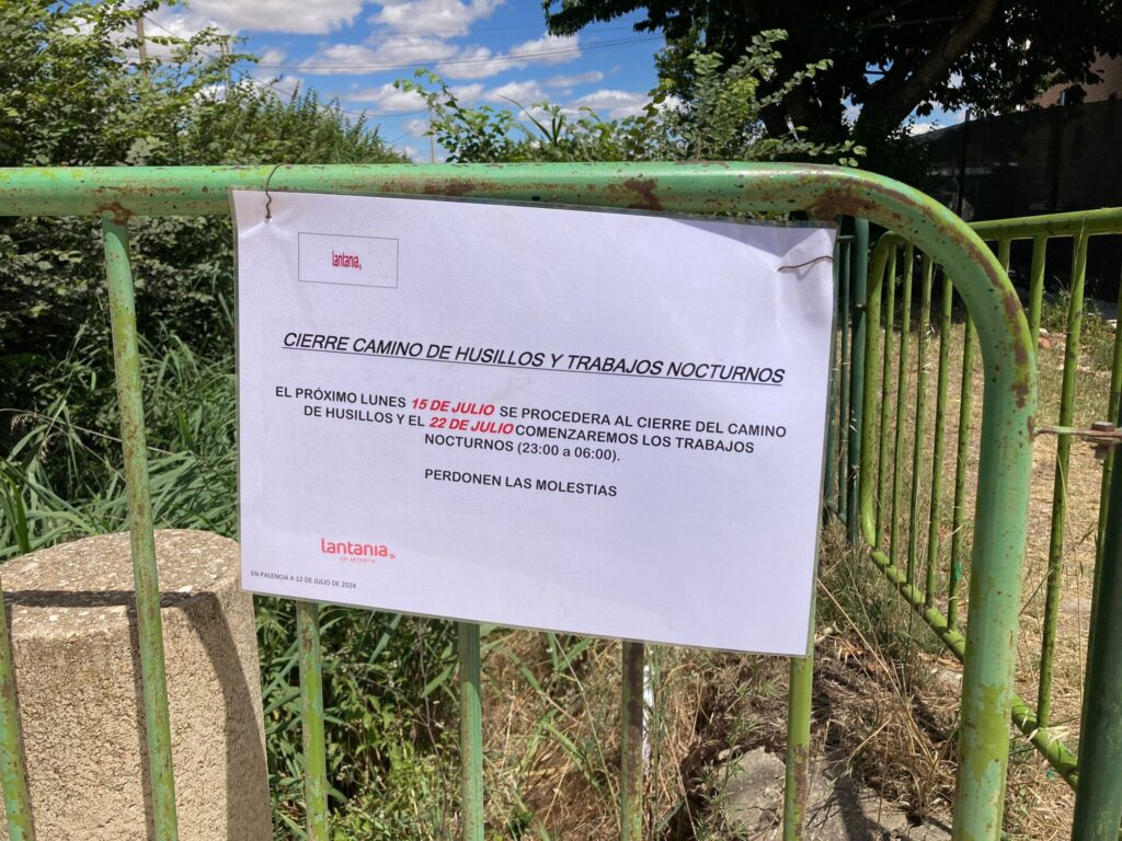 Se han colocado vallas y carteles anunciando el cierre del Camino Viejo de Husillos este lunes y el inicio de los trabajos nocturnos el día 22