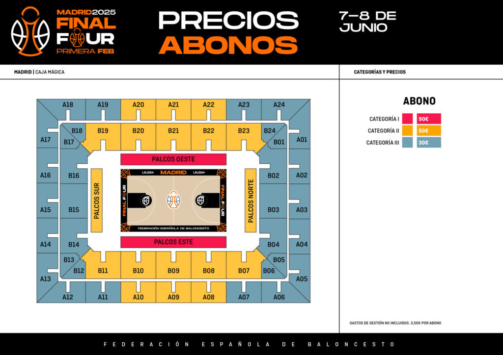 A estos precios hay que añadir los gastos de gestión que serán de 3,5 euros por cada abono adquirido a través de la página web de la FEB y que estarán disponibles a partir del martes, cuando la compra de los abonos preferentes a través de los clubes se dé por terminada.