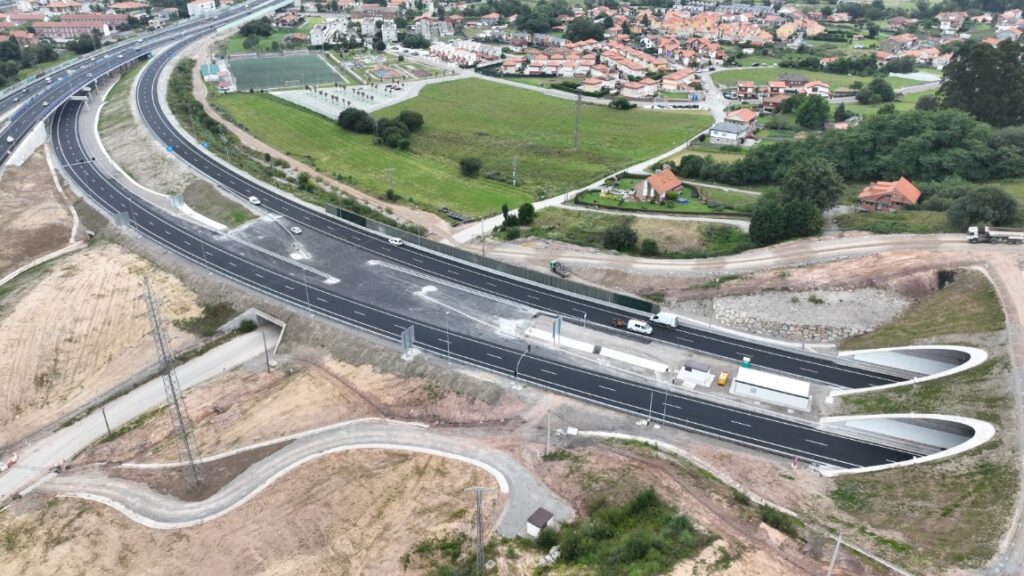 Nuevo enlace en Barreda, al norte de Torrelavega. El ramal de continuación (desde y hacia Palencia) es el de la izquierda, que pasa bajo los falsos túneles. / Ministerio de Transportes