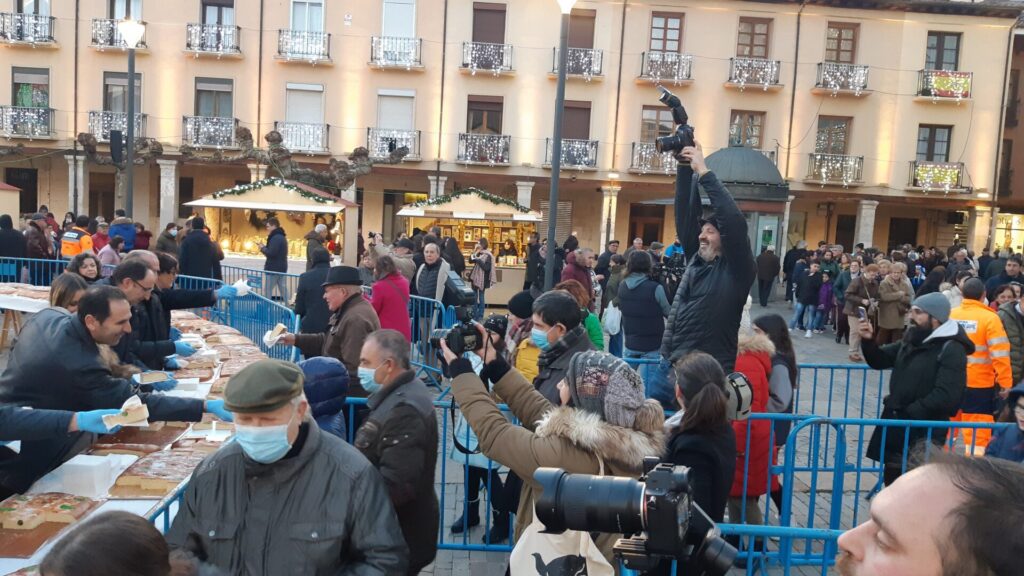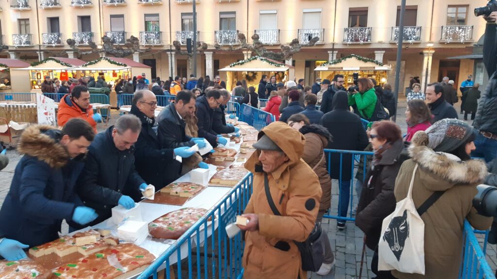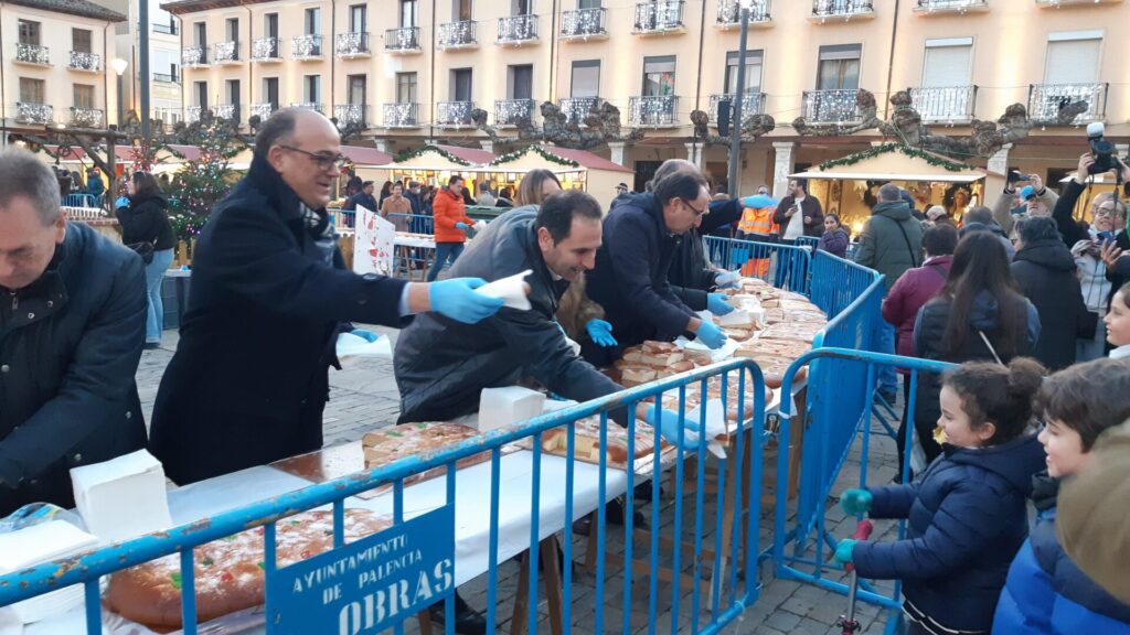 A un ritmo de 100 raciones por minuto y unos 75 minutos después que el alcalde de Palencia, Mario Simón, flanqueado por el concejal de Hacienda, Luis Miguel Cárcel, y la de Cultura, Turismo y Fiestas, Laura Lombraña, arrancara la entrega, el dulce recordatorio de que estamos en Navidad se acabó.