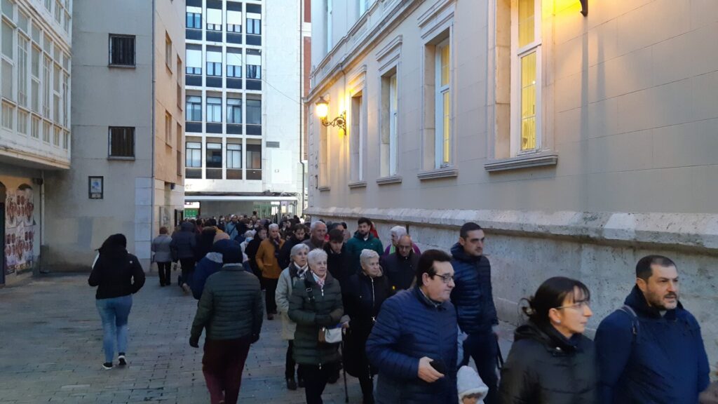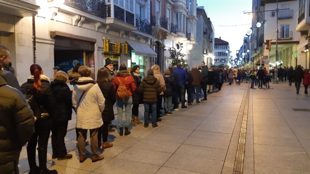 Frente a ellos nacía/moría una cola dirigida por los voluntarios de Protección Civil y que no encontraba su cabecera hasta muy lejos de la Plaza Mayor. “¿Pero dónde acaba esto?”, se sorprendía un padre de familia que había acudido directamente a la Plaza Mayor, mientras salía del ágora palentino en pos de un lugar en la cola. Y se sorprendía en la travesía del Secretario Vázquez. Lejos, muy lejos de donde tendría que acudir. “Llega la cola a Correos”, explicaba a sus compañeros de reparto la concejal Charo García.